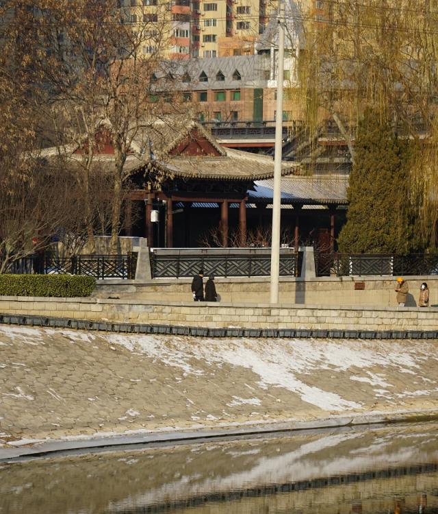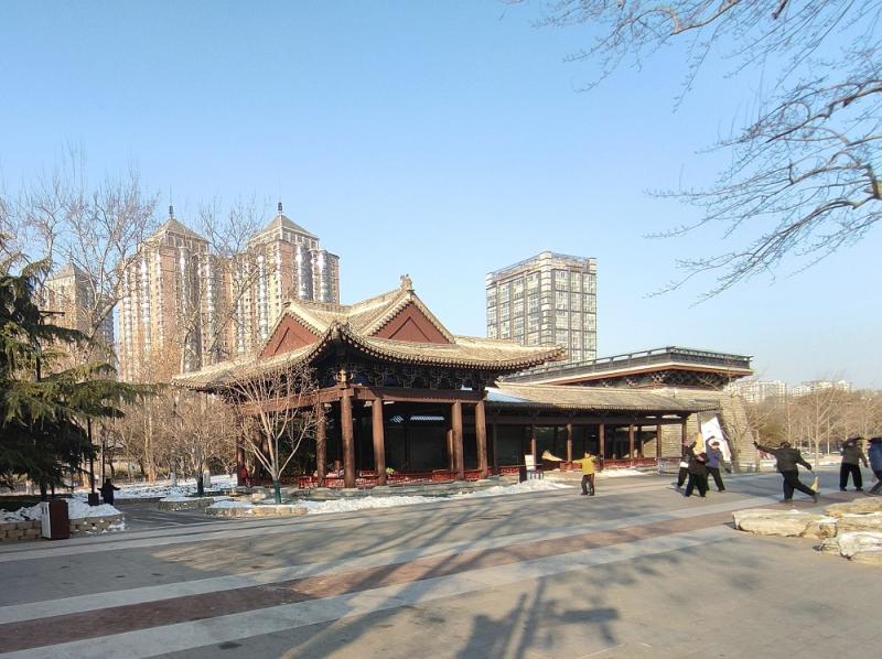 500余亩的公园,以东西两湖为中心,仿古建筑环湖而建,可惜的是湖中无水。在园中游览的以附近居民为主,大爷大妈们绕着湖快步走,遇见熟人还会打个招呼:“几圈了?”