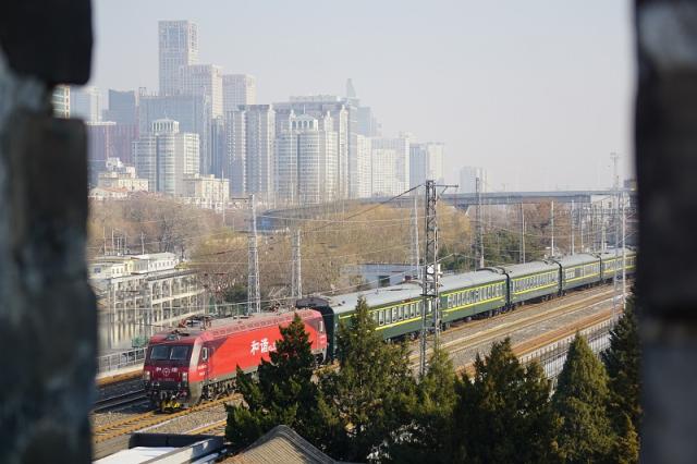 朝东北,近景是铁轨和列车,远景是CBD高耸入云的大厦。北京城不断向外扩展,这条铁路,见证着从东二环到东六环再到城市副中心的落成。古老的城墙、飞驰的列车、发展的城市,在同一幅画面里碰撞。