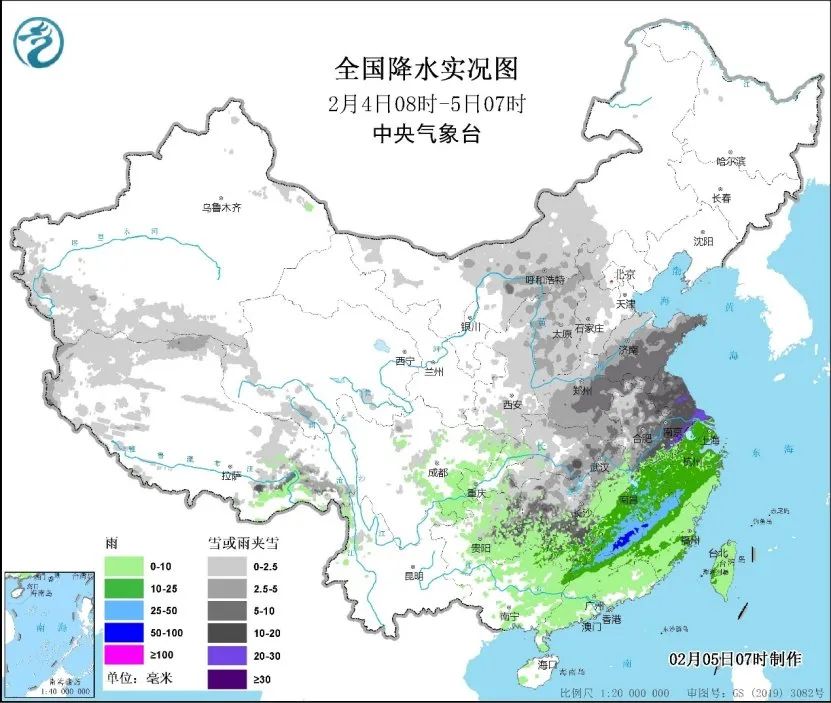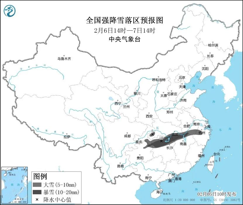 2月5日14时至6日14时,湖南北部、湖北南部、安徽南部等地有大雪(5至8毫米)。上述地区新增积雪深度2至5厘米。