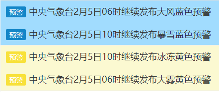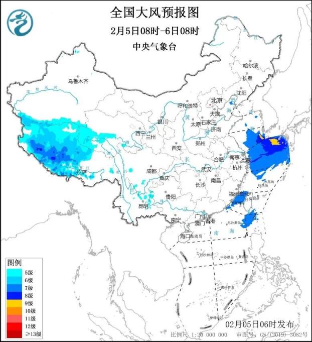 预计,2月5日08时至6日08时,西藏中西部、青海西南部等地将有5至7级、阵风8级的大风;黄海南部海域、东海大部海域、台湾海峡、巴士海峡将有7至8级、阵风9级的大风,其中黄海东南部、东海东北部的部分海域风力可达9级、阵风10级。