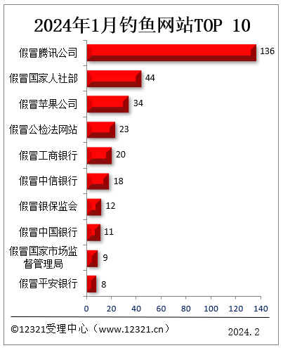 根据12321网络不良与垃圾信息举报受理中心(www.12321.cn)接到网民投诉的短信、邮件、网站等信息,2024年1月,被投诉的钓鱼网站前十名如下: