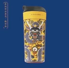 灵感取自故宫博物院清中期藏品“金地缂丝彩云蓝龙纹皮龙袍”,金黄的杯身布满祥云,满地的缠枝勾莲使得画面层次丰富,腾云驾雾的蓝龙犹如点睛之笔,令整个随行杯“黄袍加身”,霸气十足,让皇家磅礴的故宫,散发迷人的咖啡香气。