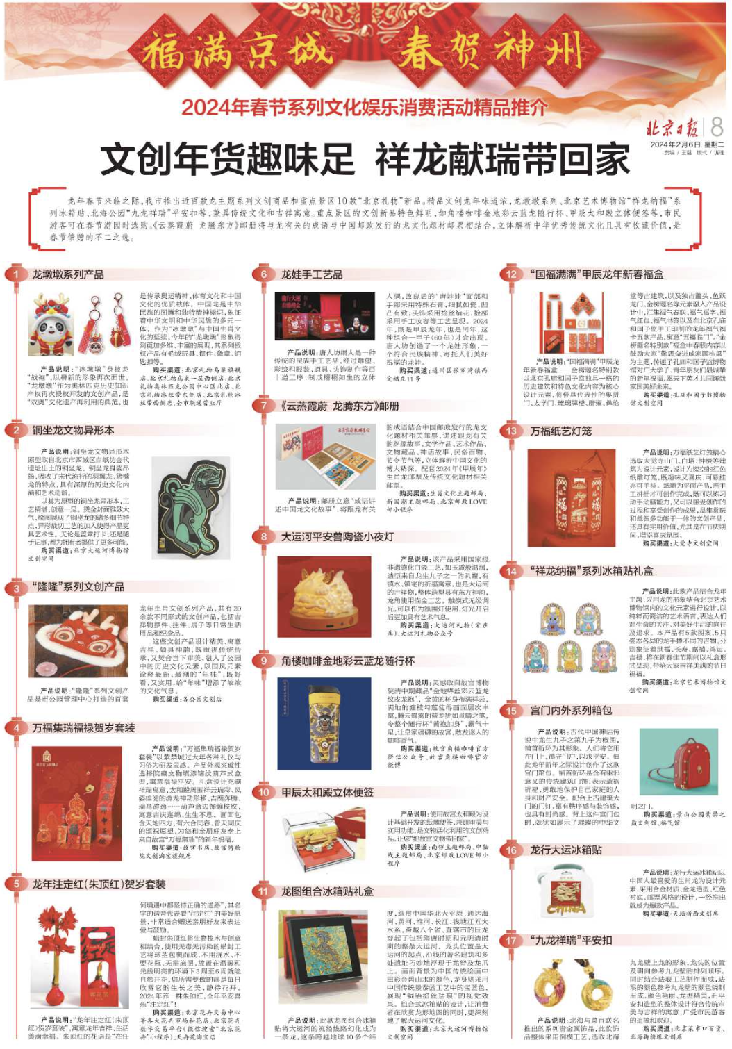 龙年春节来临之际,北京推出近百款龙主题系列文创商品和重点景区10款“北京礼物”新品。