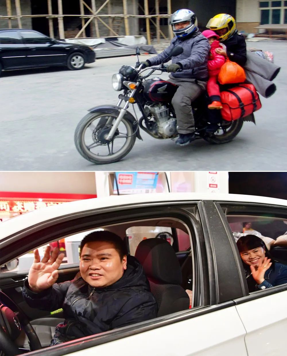 拼版照片:上图为2013年2月2日,在福建务工的董日旭带着家人骑摩托车返回江西老家过年(新华社发);下图为2020年1月15日,董日旭开着他新买的汽车,准备和家人开车返乡过年(新华社记者 魏培全 摄)。