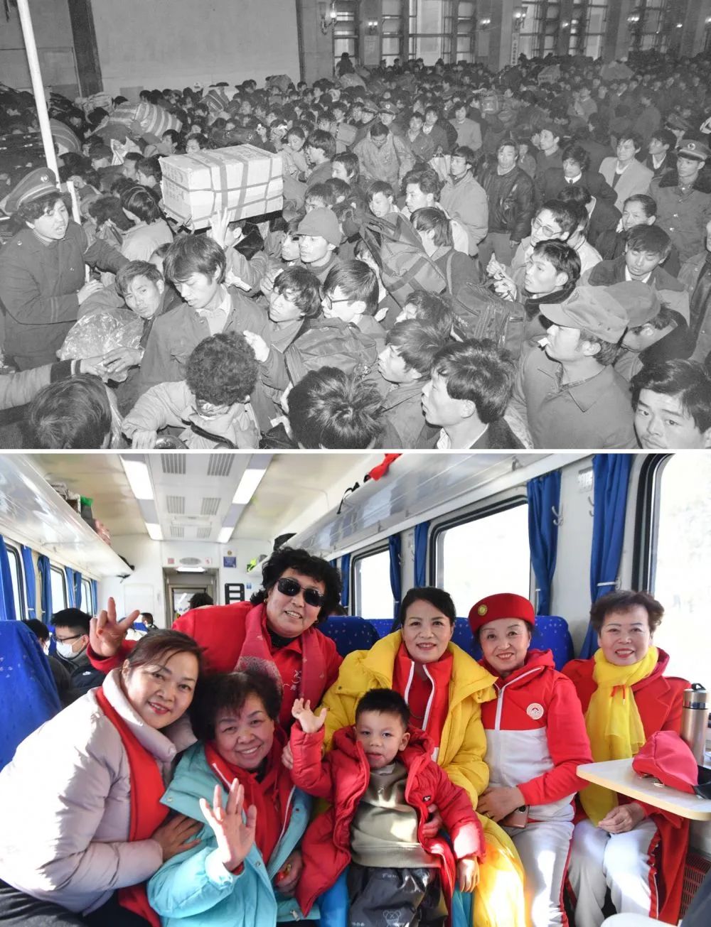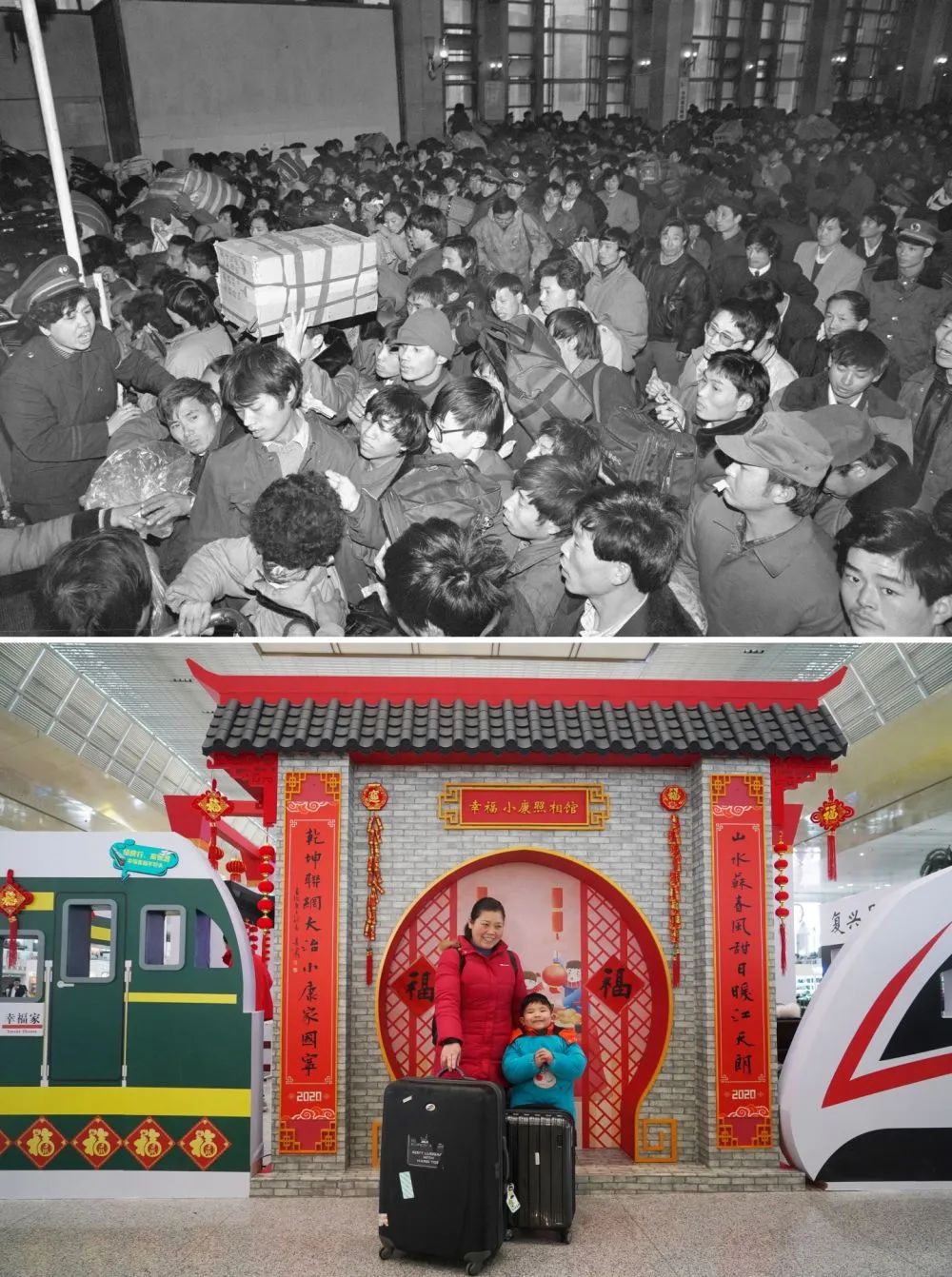 拼版照片:上图为1993年1月12日,北京火车站开始进入春运高峰,旅客在排队进站(新华社记者 唐召明 摄);下图为2020年1月10日,旅客在南京南站内布置的“幸福小康照相馆”拍照留念(新华社记者 季春鹏 摄)。