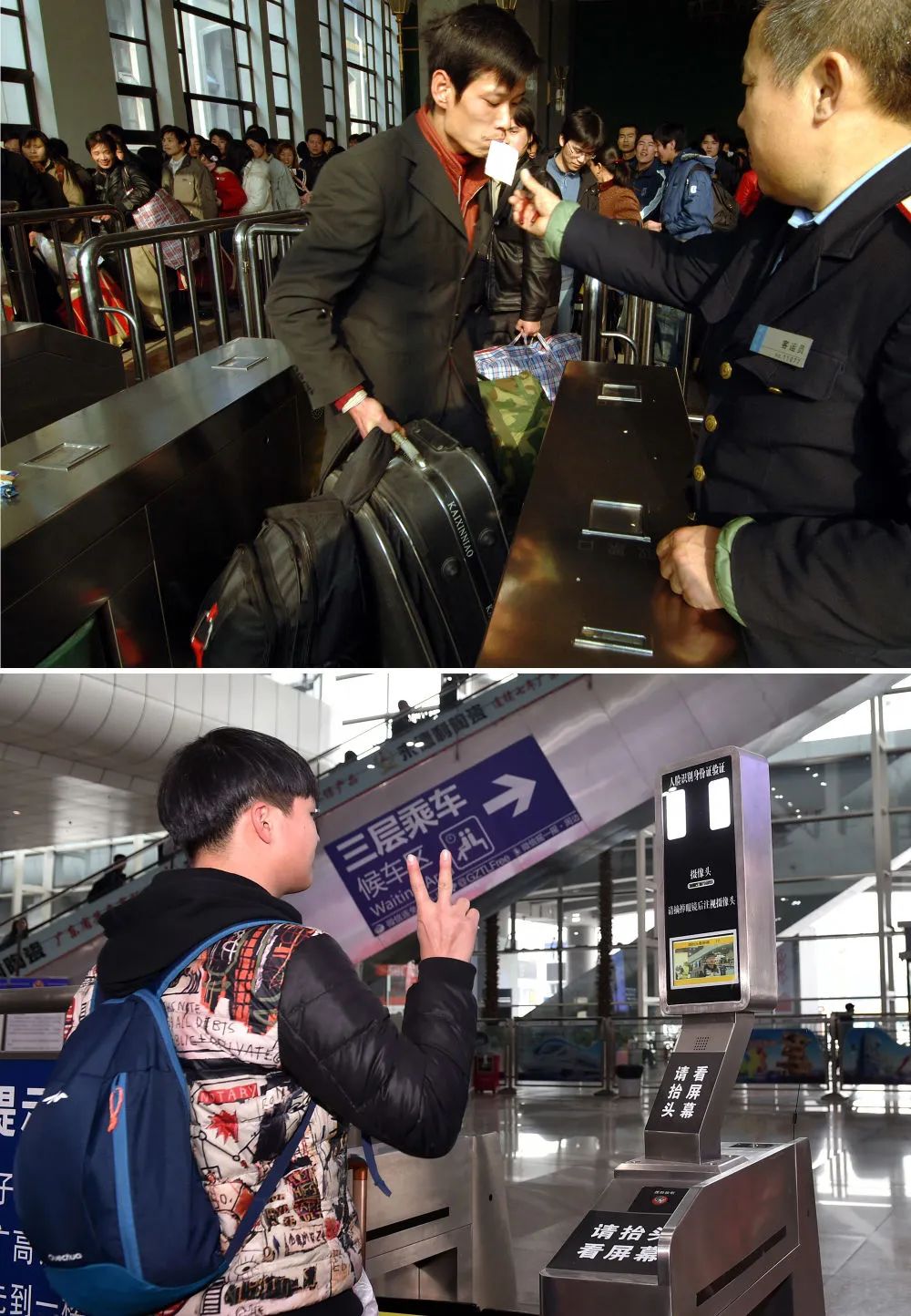 拼版照片:上图为2006年1月14日,旅客在北京站通过人工检票进站(新华社记者 李文 摄);下图为2017年1月13日,一名旅客在广州南站体验使用人脸识别系统验票验证进站(新华社记者 梁旭 摄)。