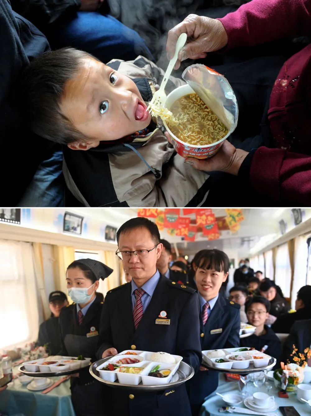 拼版照片:上图为2011年1月21日,在广东首趟外来务工人员专列L160次列车上,一位乘客在喂孩子吃方便面(新华社记者 郭晨 摄);下图为2024年1月17日,乘务员在K212/209次列车餐车上展示盒饭套餐(新华社记者 黄宗治 摄)。