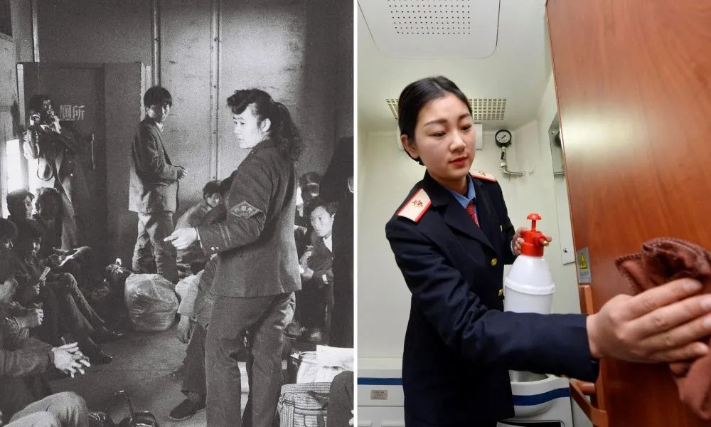 拼版照片:左图为1994年春运期间,在济南铁路局“棚代客”列车上,乘务员在向乘客讲解临时搭建的简易厕所使用注意事项(新华社发);右图为2017年1月12日,在兰州铁路局银川客运段增开的银川发往北京的临时旅客列车上,乘务人员在清洁车上的卫生间(新华社记者 彭昭之 摄)。