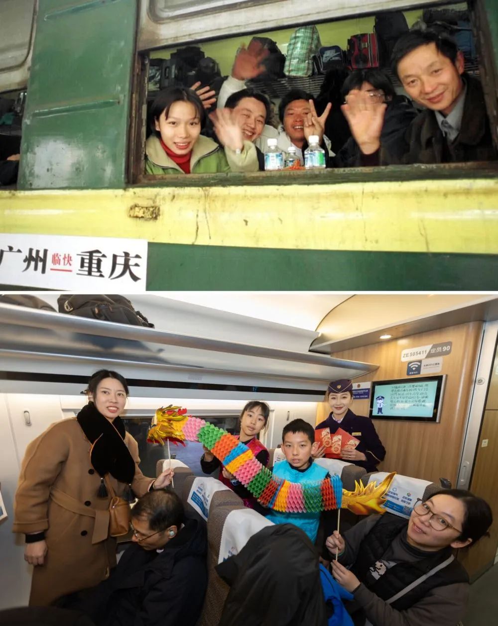 拼版照片:上图为2000年春运期间,在深圳打工的重庆乘客在广州火车站乘火车返乡(新华社记者 壮锦 摄);下图为2024年1月26日,旅客在G10次高铁车厢内舞动龙年装饰(新华社记者 王翔 摄)。