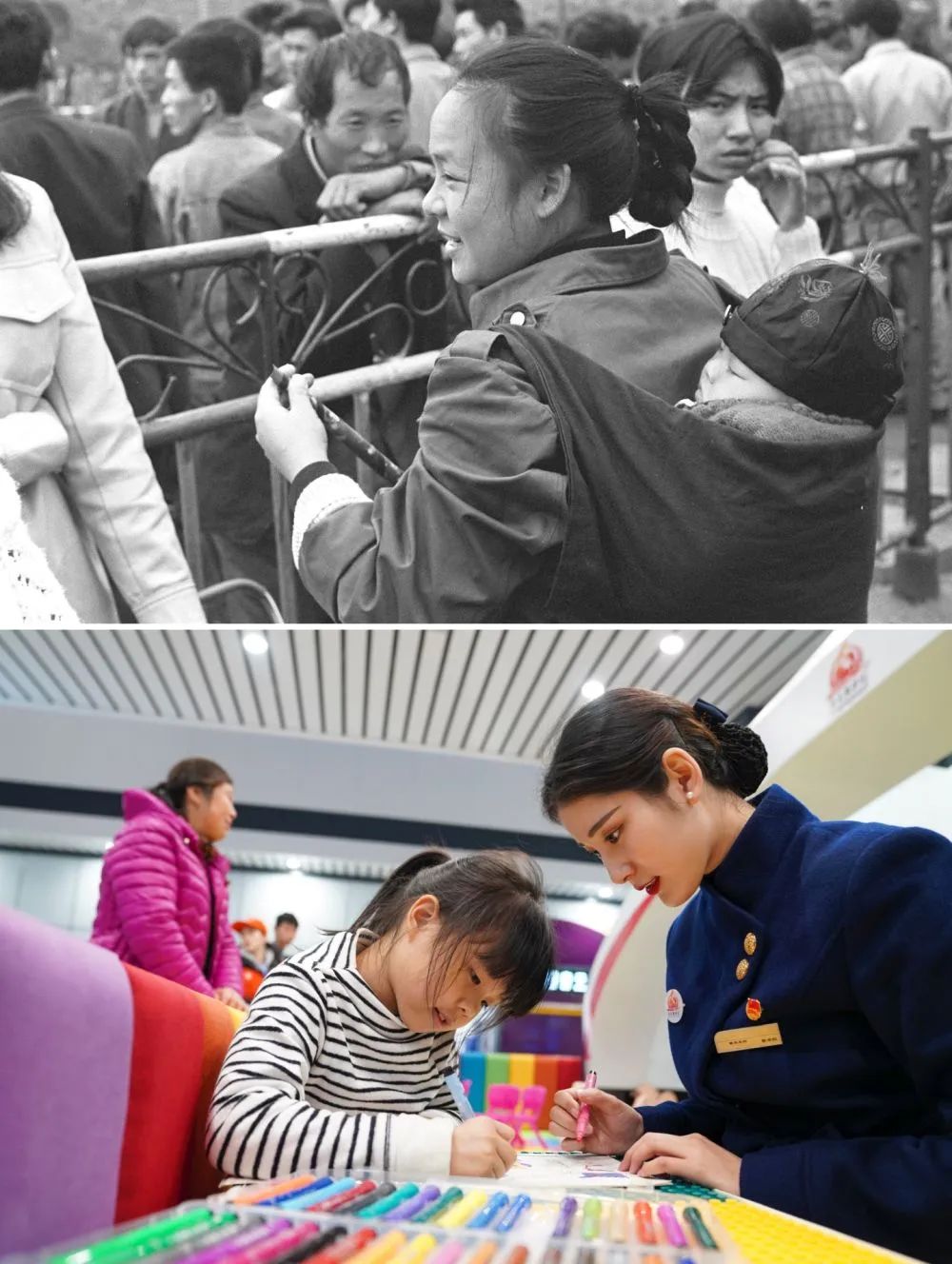 拼版照片:上图为1995年春运期间,在广州火车站,来自四川的“打工妹”赶早乘火车回家过年(新华社记者 陈学思 摄);下图为2020年1月10日,在重庆西站红岩服务站的儿童游乐园内,志愿者曾念红(右)陪伴候车的小朋友画画(新华社记者 刘潺 摄)。