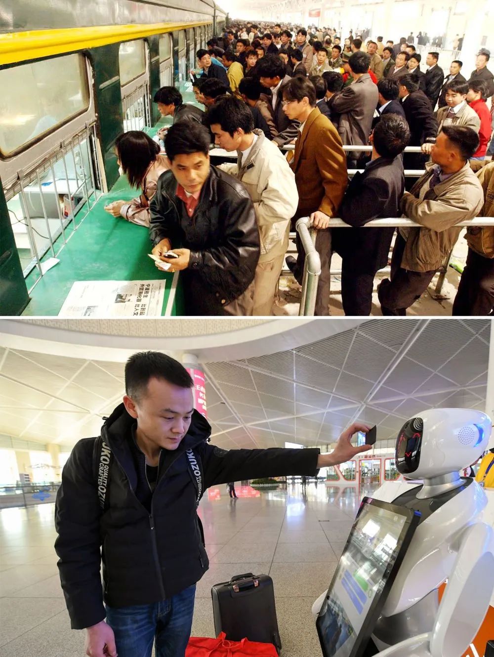 拼版照片:上图为2003年1月20日,旅客们在位于广州市黄沙大道的一家仓库中的临时售票处购买车票(新华社记者 周文杰 摄);下图为2019年1月22日,在呼和浩特火车东站,旅客将车票放在智能机器人面前扫码获取乘车信息(新华社记者 彭源 摄)。