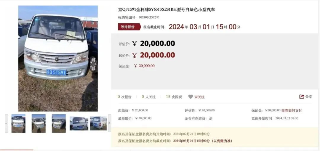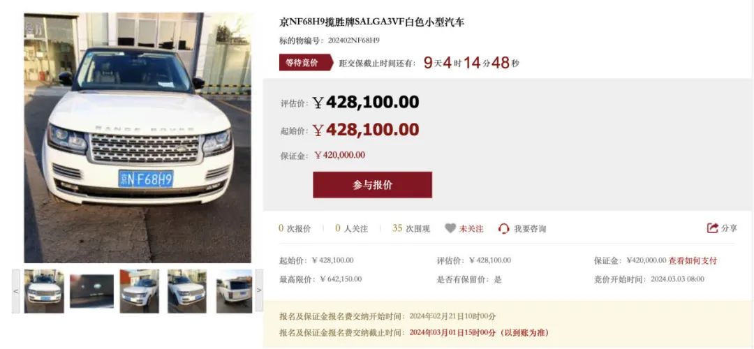 记者注意到,本次司法处置的小客车中,评估价最高为42.81万元,是一辆2015年的揽胜汽车。评估价最低的三辆车仅2万元,分别是2009年的金杯汽车、2006年的帕萨特汽车以及2007年的长安汽车。