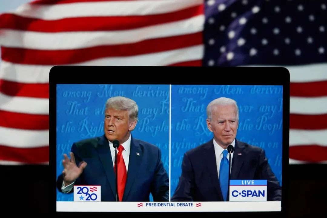 这张2020年10月22日在美国弗吉尼亚州阿灵顿拍摄的视频画面显示,特朗普(左)与拜登在田纳西州纳什维尔市参加总统候选人电视辩论。新华社记者刘杰摄