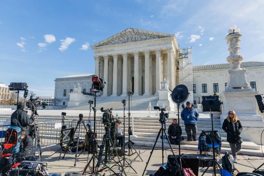 2月8日,媒体记者聚集在美国首都华盛顿的美国联邦最高法院外进行报道。新华社发(亚伦摄)