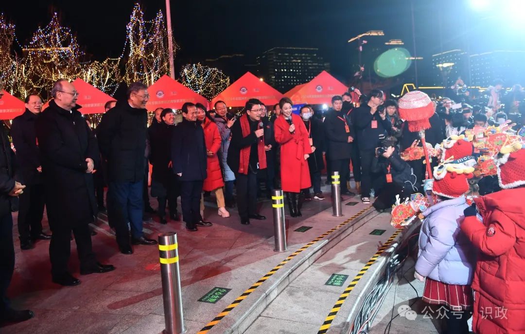 夜幕下的蓝色港湾,灯光璀璨、美轮美奂,形式多样的促销活动、文体表演和互动体验,吸引众多市民前来消费娱乐。尹力、王文涛、慎海雄、殷勇等领导先后来到年货大集、品牌街、露营用品展区、中央广播电视总台和北京广播电视台展区等活动区域,察看京津冀三地特色商品及非遗传承工艺展示,结合产品了解新能源汽车销售模式、老字号创新举措,询问商文旅体多元消费业态融合发展等情况,并通过现场大屏幕了解三地特色产品带货直播情况,察看“北京春节时间”状元榜,了解春节市场的红火景象和销售额。启动仪式上,随着尹力、王文涛、慎海雄、殷勇等领导共同敲响大鼓,电子“火凤凰”在空中飞舞盘旋,传统舞龙表演腾跃翻滚,寓意龙凤呈祥,标志着2024年全国消费促进月暨京津冀消费季正式启动。