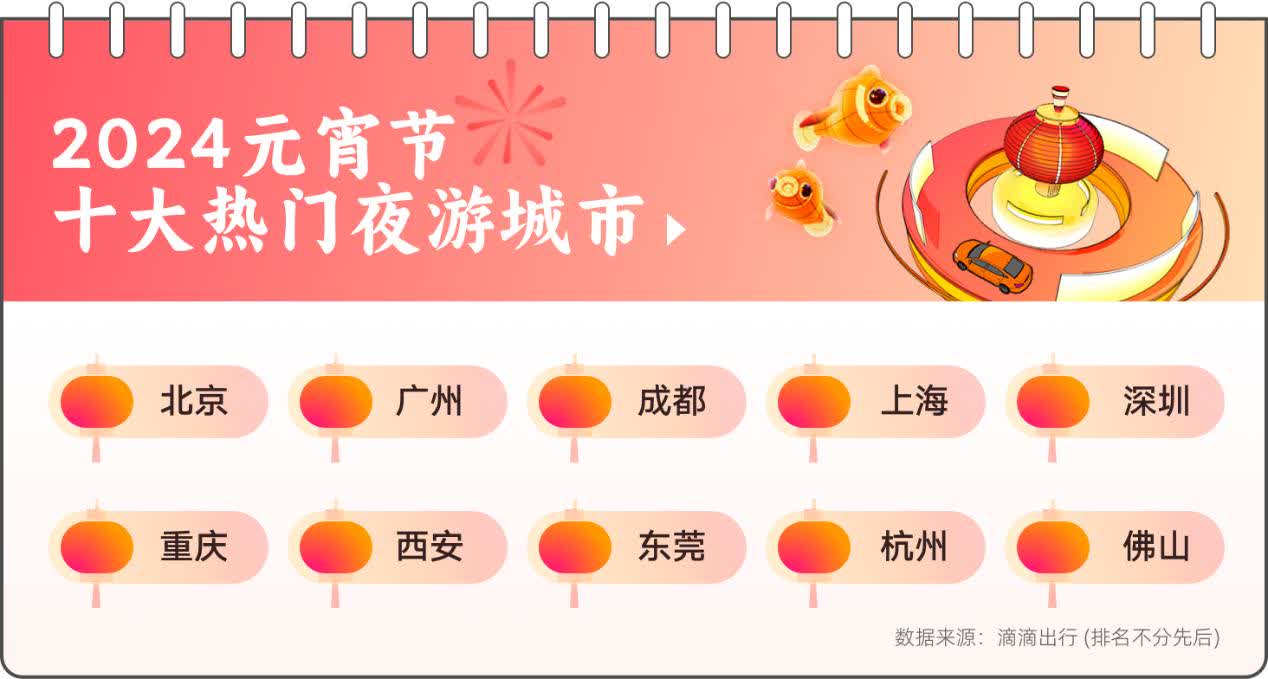 今年元宵节,滴滴打车需求较去年同期上涨40%,其中美食、大型商圈等休闲娱乐场景的夜间打车需求上涨47%。根据滴滴打车数据来看,北京、广州、成都、上海、深圳、重庆、西安、东莞、杭州、佛山是今年元宵节十大热门夜游城市。