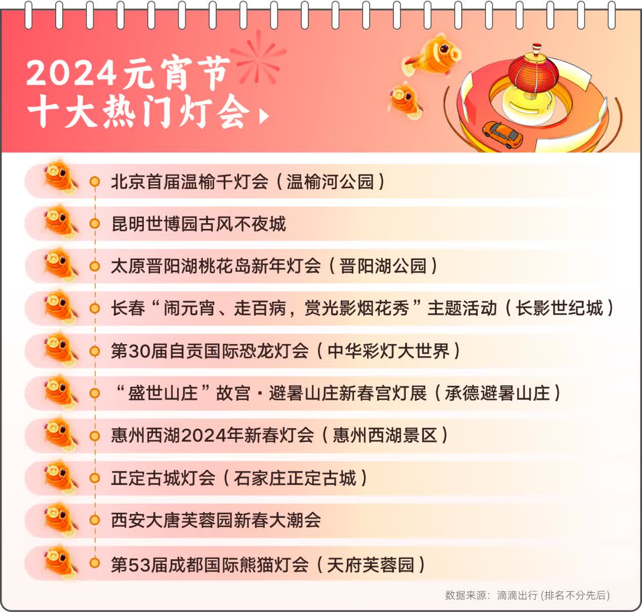 花市灯如昼,一夜鱼龙舞。千百年来,灯会一直是元宵节的氛围感“天花板”。今年元宵节,各地灯会、灯光秀等活动吸引大量游人前往,前往热门灯会地点的滴滴打车需求量相比去年元宵节涨幅超100%,其中北京首届温榆千灯会等灯会举办地涨幅超10倍。