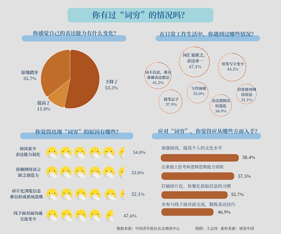沟通交流是人际互动的重要方式。语言和文字表达的背后是思维和认知。随着网络媒介的发展,依靠流行语、表情包就能“直抒胸臆”,但这种浅白直接的输出方式,让一些复杂深邃的表达逐渐被遗忘。在离开网络环境、需要进行规范化表达时,一些年轻人只剩下了干瘪的文字和磕绊的语言。近日,中国青年报社社会调查中心的一项调查显示,超半数受访青年感觉近几年自己的语言文字表达能力下降,47.1%的受访青年感觉自己词汇量匮乏、表达单一。为什么在青年群体中出现了“词穷”的现象?如何丰富自己的语言,让“梗阻”的表达顺畅起来?记者采访了多位年轻人和相关领域专家,共同探讨这一问题。