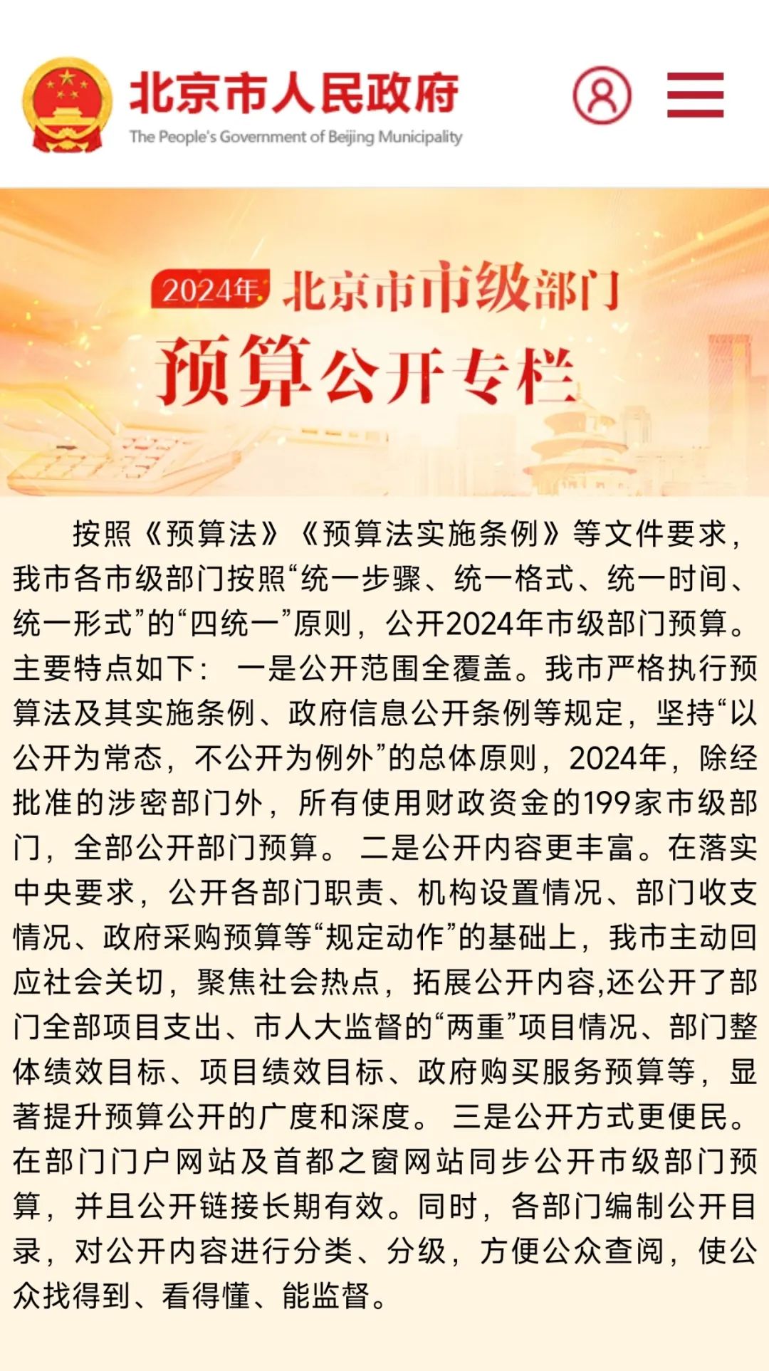 2月29日10时起,北京199家市级部门按照“统一步骤、统一格式、统一时间、统一形式”的“四统一”原则,在各部门门户网站及首都之窗网站统一公开2024年预算。