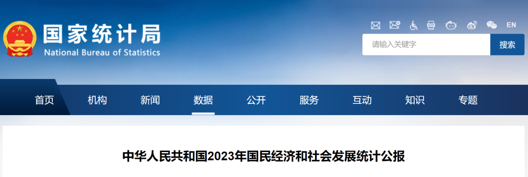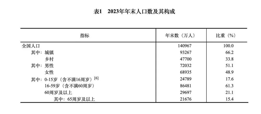 统计公报发布了人口数据。2023年年末全国人口140967万人,比上年末减少208万人,其中城镇常住人口93267万人。全年出生人口902万人,出生率为6.39‰;死亡人口1110万人,死亡率为7.87‰;自然增长率为-1.48‰。