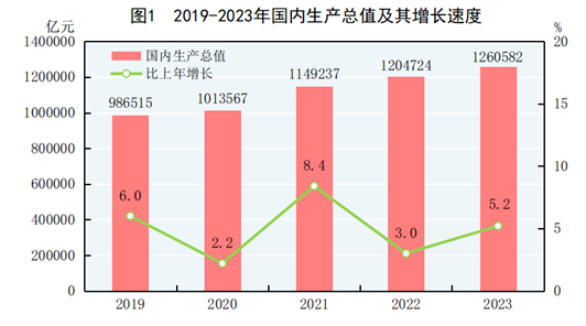 2023年,我国经济总量稳步攀升,国内生产总值(GDP)超过126万亿元,比上年增长5.2%,实现了5%左右的预期目标。
