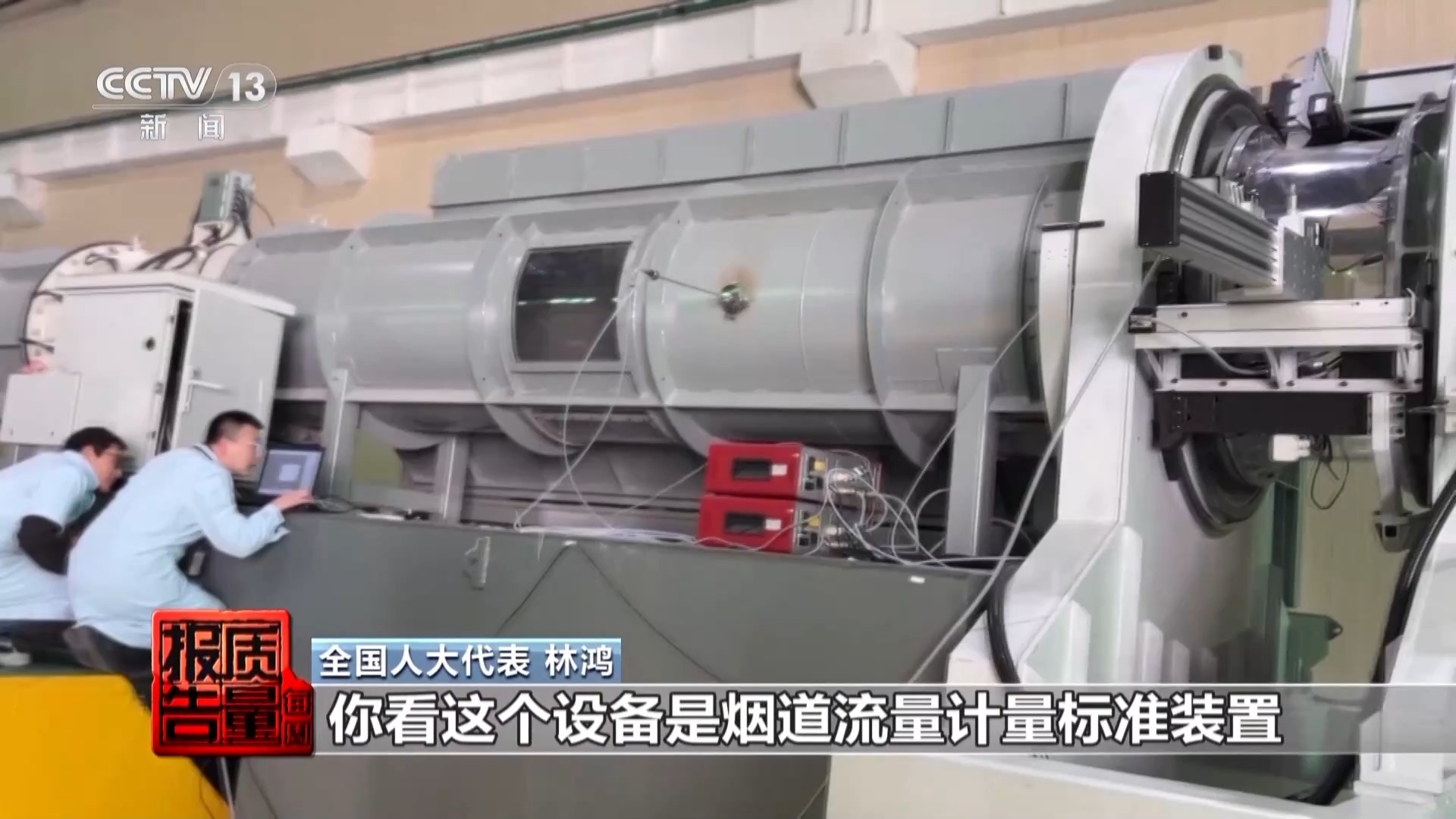 全国人大代表 林鸿:你看这个设备是烟道流量计量标准装置,它是解决了企业排放量测量不准确的难题。有了它之后, 把企业测量的误差从50%改善到5%以下,那么目前它的测量范围、测量精度,都是超过美国。
