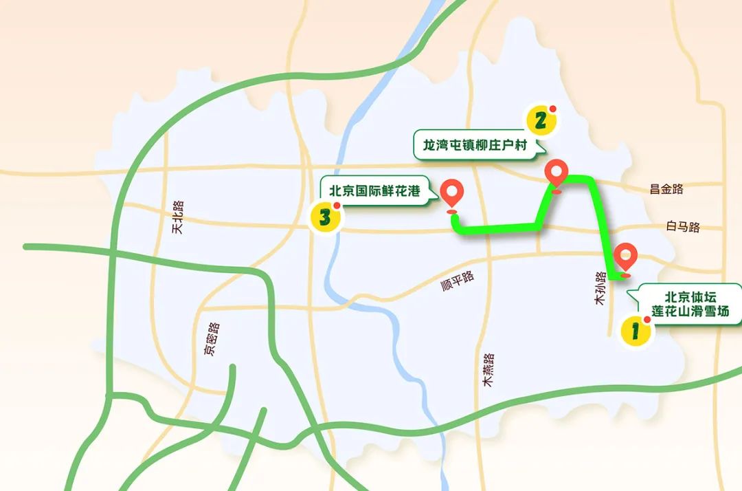 线路:北京体坛莲花山滑雪场——龙湾屯镇柳庄户村——北京国际鲜花港