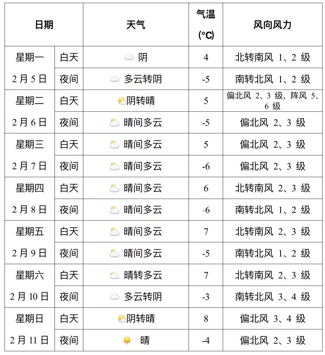 周一多云转阴,最低气温在-5℃。周二阴转晴,阵风较大5、6级,气温在-5℃至5℃,请做好防范。