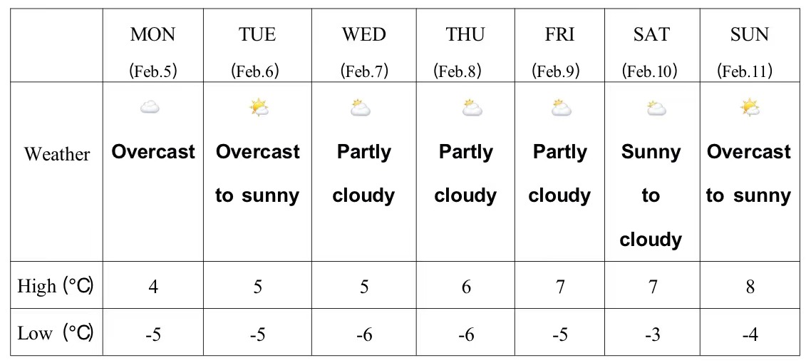 On Monday, it will be cloudy and turn cloudy, with the lowest temperature is -5℃. On Tuesday, it will be cloudy and sunny, with strong gusts of 5 or 6 levels and temperature ranging from -5℃ to 5℃. Please take precautions.