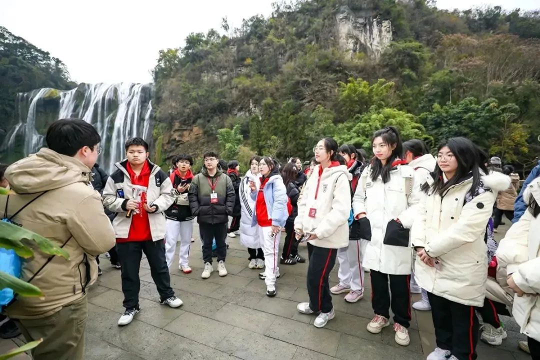 学生们在花果树瀑布下学习喀斯特地貌。