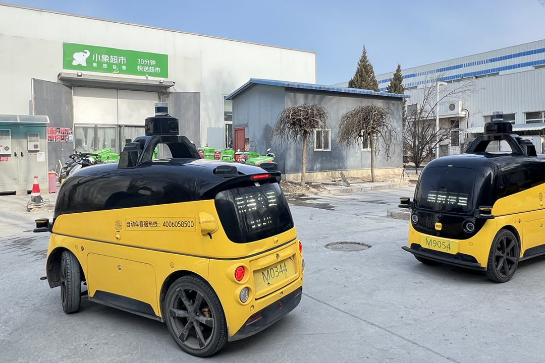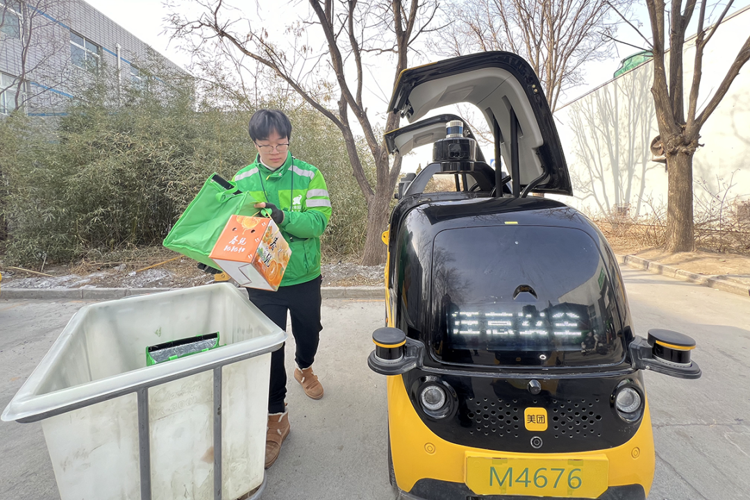 记者在美团小象超市后沙峪站点看到,工作人员将分包好的货物装入自动配送车,一键发车,几分钟后便到达指定收货点,货物将由配送员为居民送货上门。