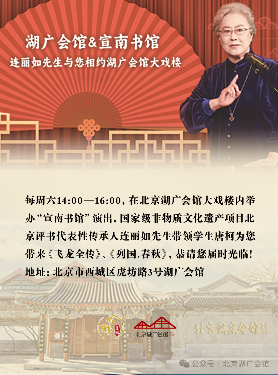 每周六14:00--16:00,连丽如先生带领学生唐柯在北京湖广会馆大戏楼内举办“宣南书馆”演出,强强联手,献上精彩评书。