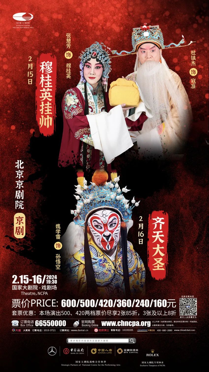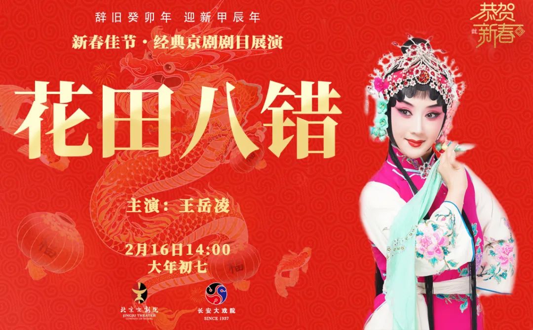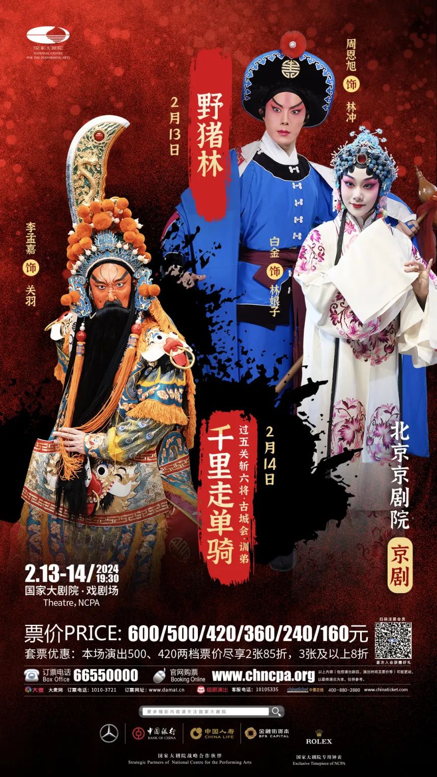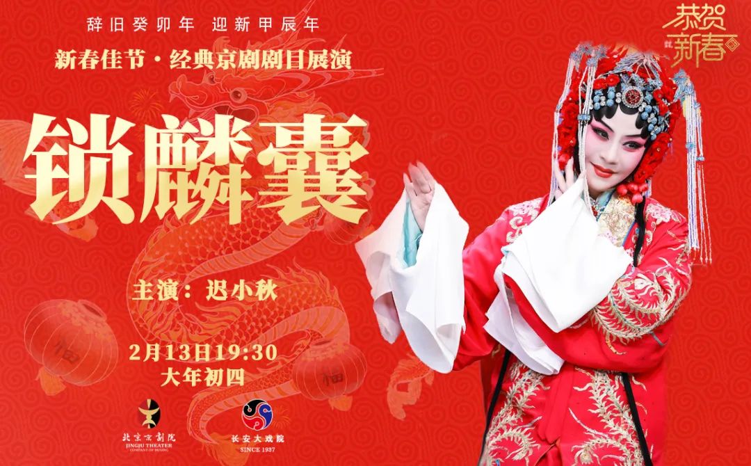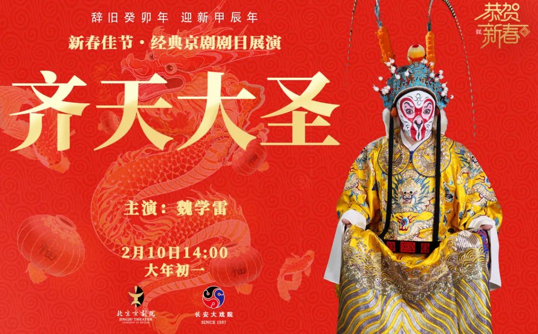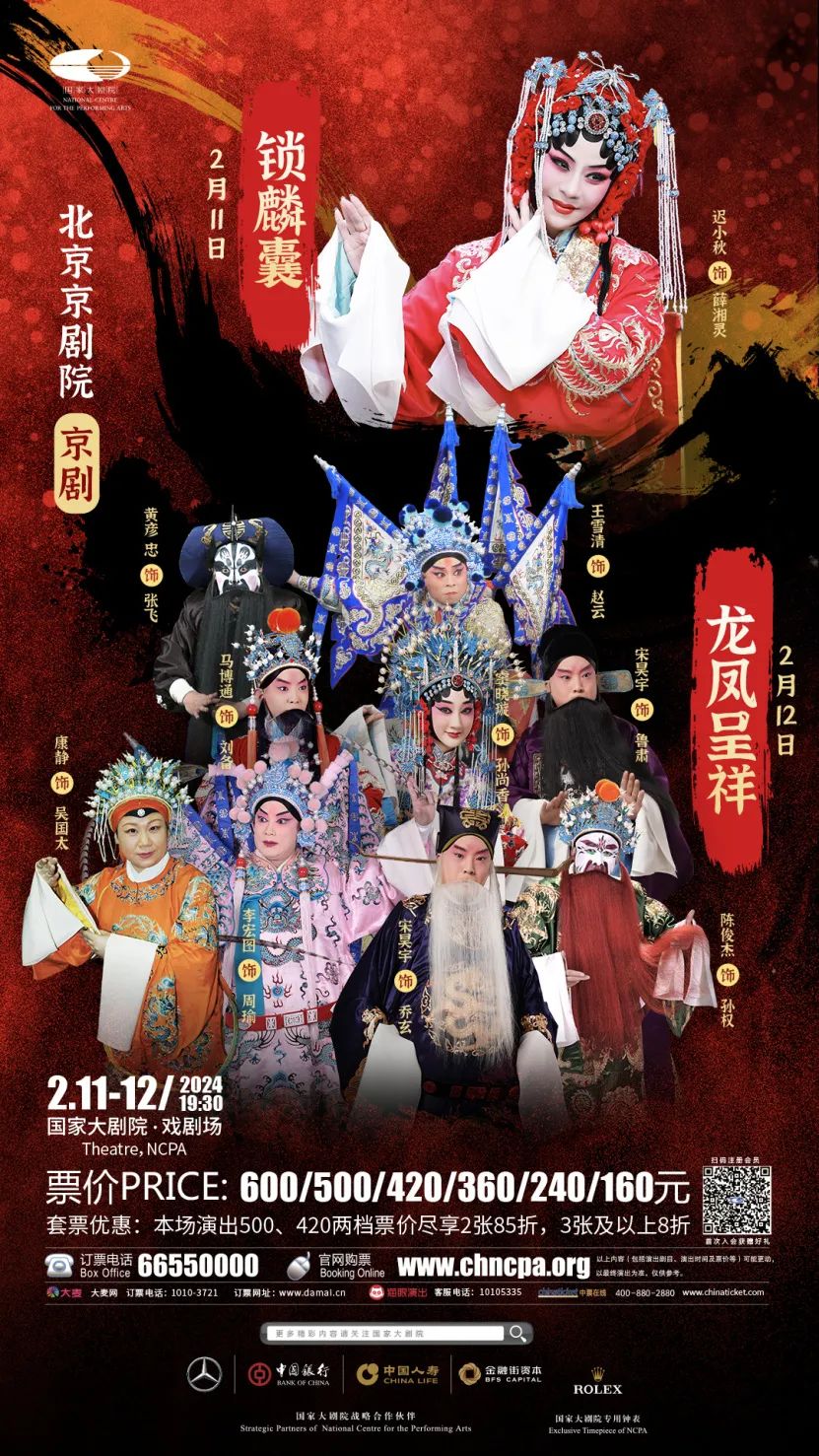 2月11日-16日大年初二到初七,《锁麟囊》《龙凤呈祥》《野猪林》《千里走单骑》《穆桂英挂帅》《齐天大圣》六台吉祥大戏在国家大剧院粉墨登场,龙腾虎跃,好戏连台!