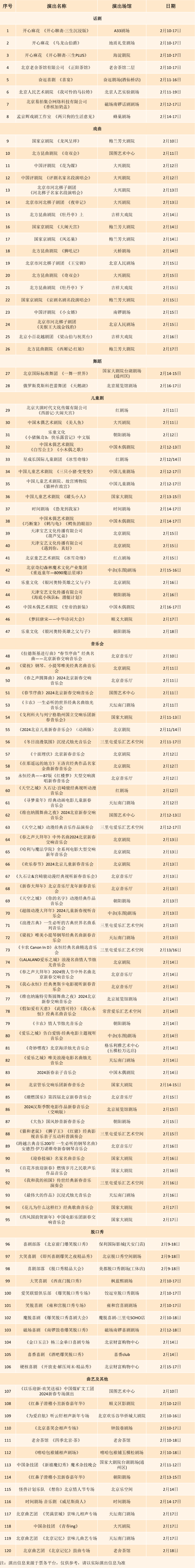 龙年春节及元宵节期间,北京京剧院将在长安大戏院、吉祥大戏院、中山公园音乐堂、国家大剧院、北京艺术中心、大兴剧院、平谷影剧院等7个剧场上演40余场京剧传统大戏。