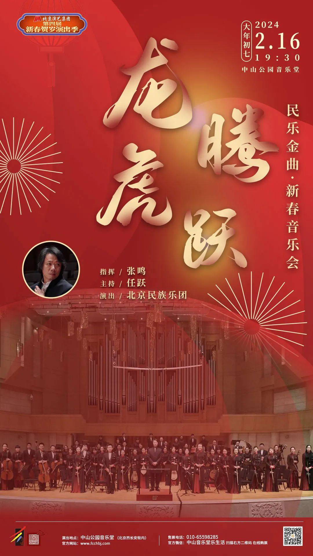 北京民族乐团将国乐融合与创新,用多彩多样的方式传递国乐魅力。2月16日大年初七,“龙腾虎跃——民乐金曲·新春音乐会”选取了大家耳熟能详的、符合节日气氛的民族音乐经典登台,有民族管弦乐《贺新春》《丰年祭》《步步高》、打击乐与乐队《龙腾虎跃》、双唢呐与乐队《百鸟朝凤》等经典曲目。