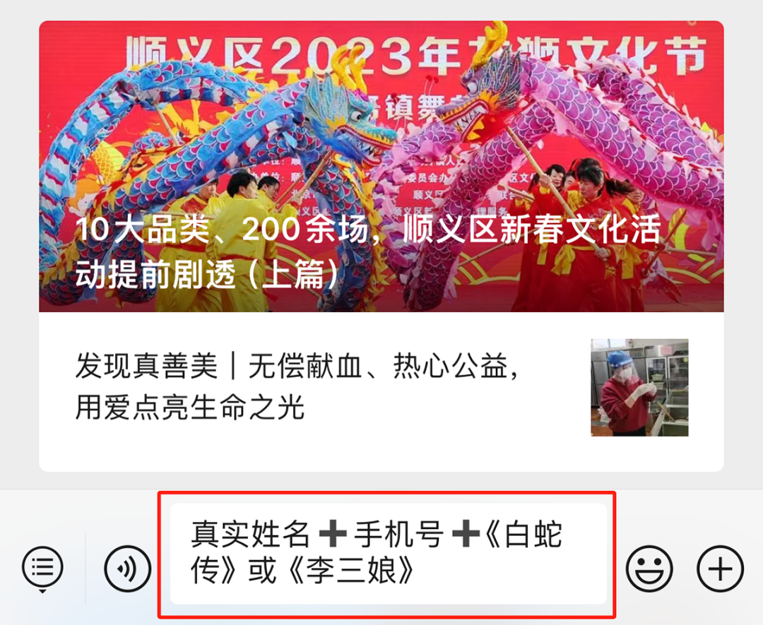 您发送“真实姓名+手机号+《白蛇传》或《李三娘》”至北京顺义微信公众号,即可参与抢票,抢票时间截至2月15日12时,逾期无效。每个微信号仅限一次机会,每人可抢2张。抢票结果将在微信平台回复告知。