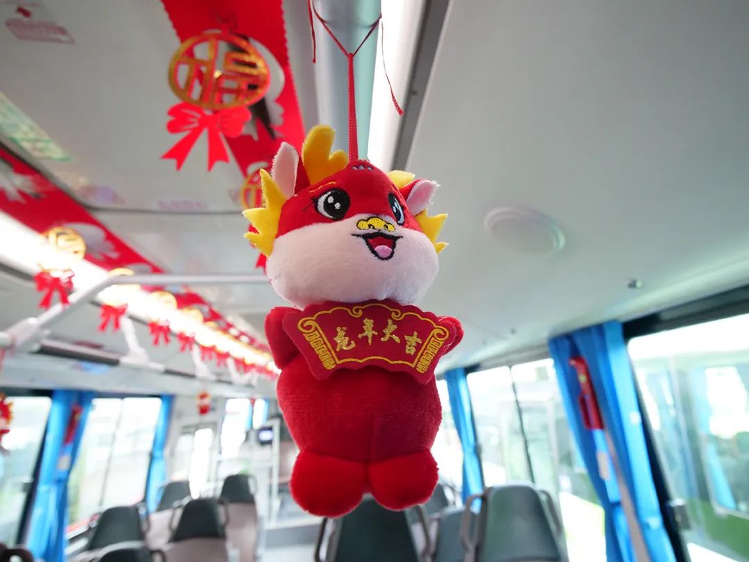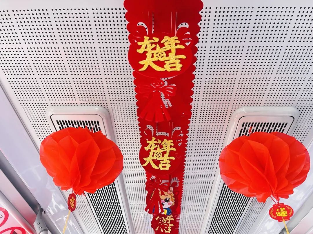 915快路车厢内的两侧拉起福字拉花,扶手上悬挂着龙年吉祥物,充满了浓厚的节日气息。“希望通过这样的布置,能让乘客感受到新春喜庆的氛围。”北京公交集团客七分公司第一车队915快路驾驶员刘春生说。