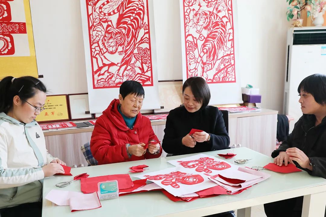 春节期间,不少村民都来找她学习剪窗花。“老师,我把这部分剪坏了,方向错了。”郝兰英接过村民剪坏的作品进行调整,把原本应该是灯笼条纹的位置变成了两只喜鹊。“剪纸不怕出错,发挥想象力都能调整过来。”郝兰英说。她7岁起就跟着奶奶学习剪纸,到现在已有60余年的剪纸经验。郝兰英一直没有停止学习的脚步,2008年曾到南京大学接受首届中国民间剪纸高级研修班的专业培训,提升剪纸技艺。