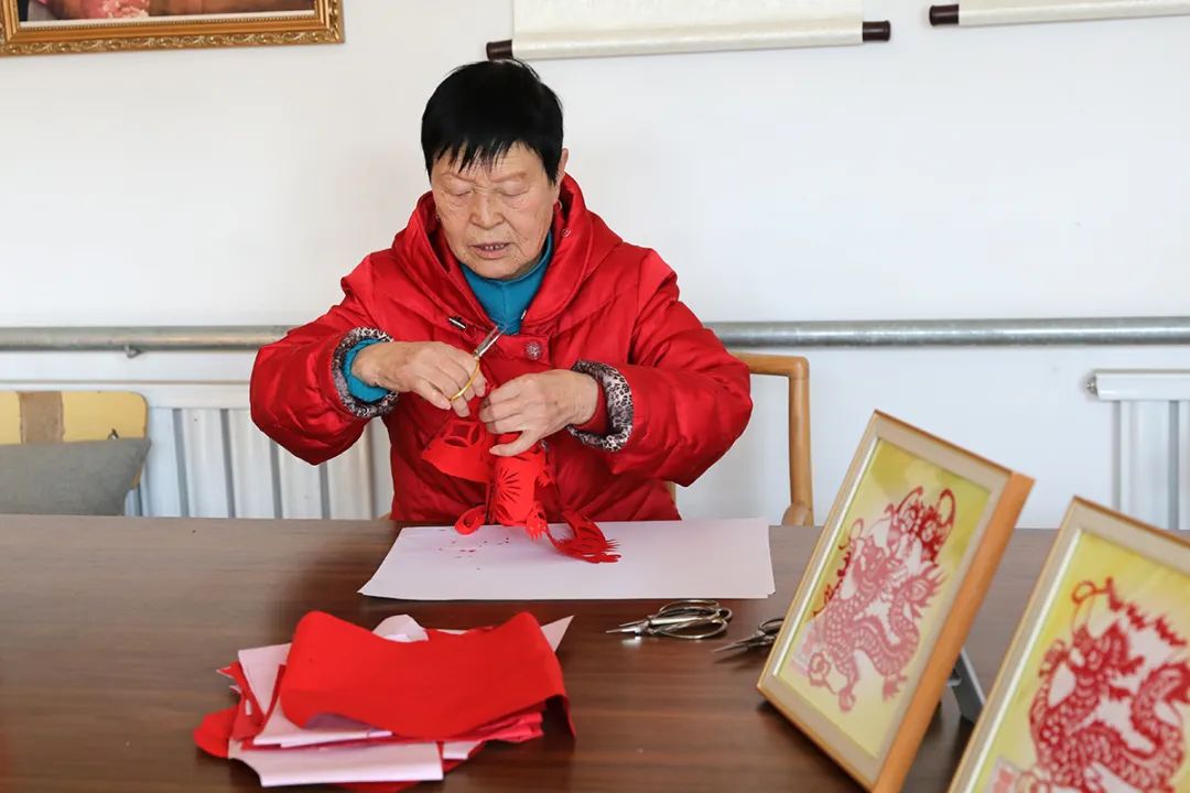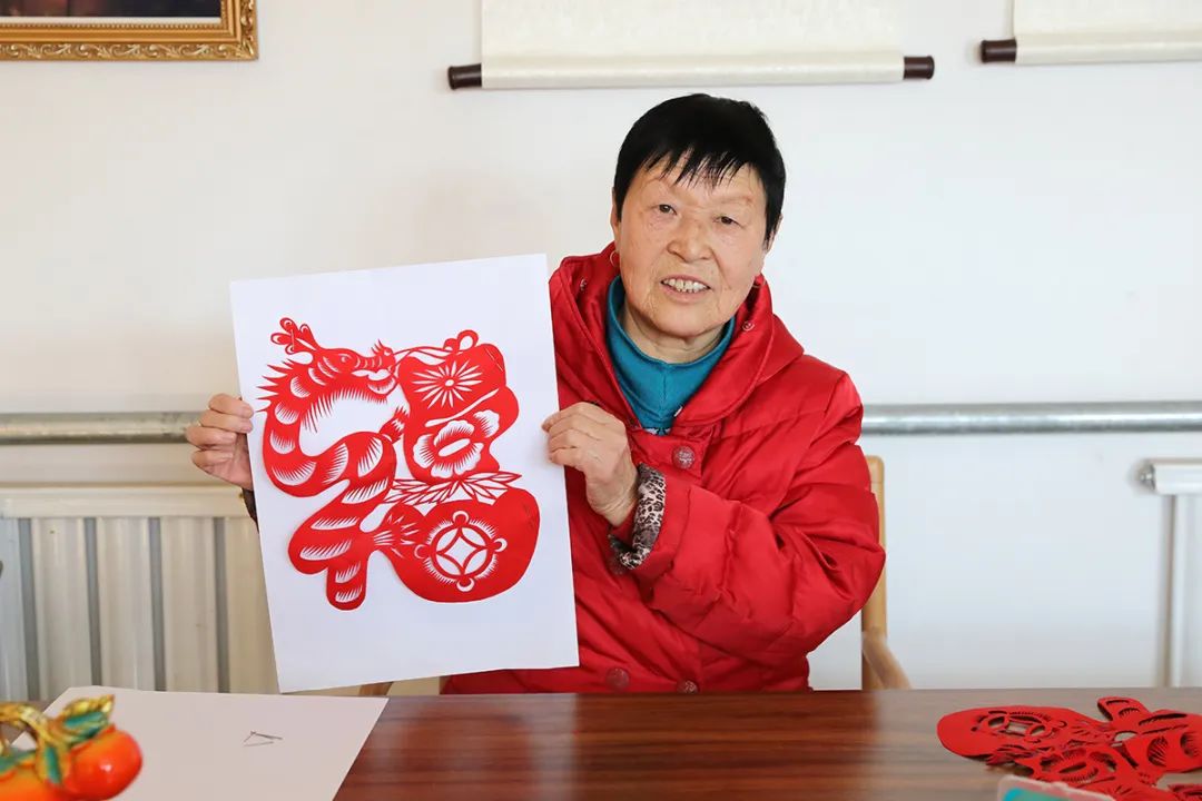 “牡丹承载着深厚的文化内涵,象征富贵吉祥,菊花寓意高洁、永恒……”郝兰英在剪纸过程中又加入了许多中国传统花卉元素。她说:“剪纸的画面要填满,不能留白,并且中间不能断开。”记者看到,最后呈现的龙年福字作品画面饱满,传递了美好新春祝福。