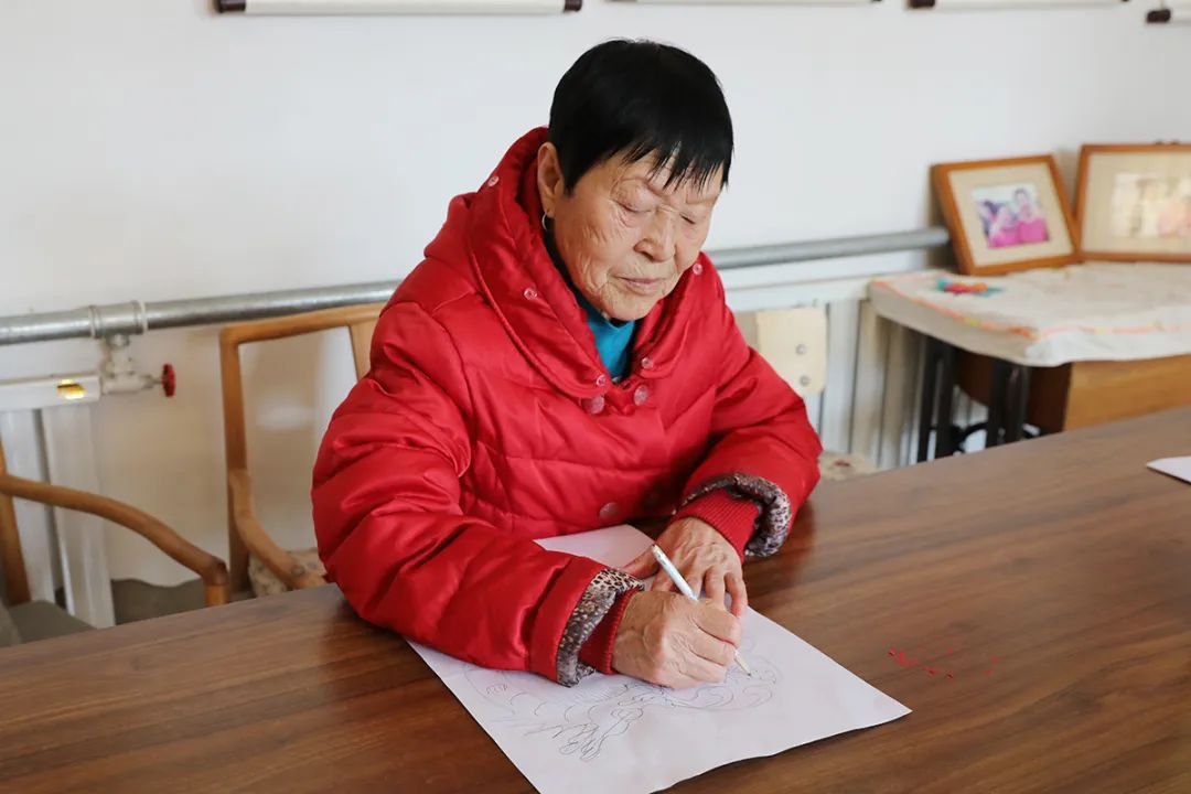 “这是样稿,剪之前先画出大概形状,细节就要在剪纸过程中逐步完善了。”郝兰英正在创作一幅龙年福字剪纸作品,她寥寥几笔就准确描绘出了福字的基本轮廓,随后,开始对照样稿剪纸。龙角、龙爪、龙须……郝兰英在福字的轮廓里剪出了龙的特征和细节,一个别致的龙年福字在她手中初见雏形。