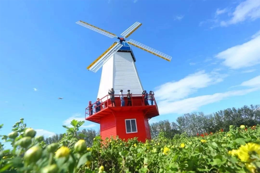 近年来,楼台村利用村南千亩农田发展生态旅游观光农业,因地制宜发展独特经济。在这个观光农田里,矗立着一架标志性的欧式风车。从盛夏到金秋,这里繁花似锦、景色宜人。微风拂过,风车随风而动,花海微微荡漾,如此美景吸引大批游客前来休闲游玩,也促进了村域经济的发展。