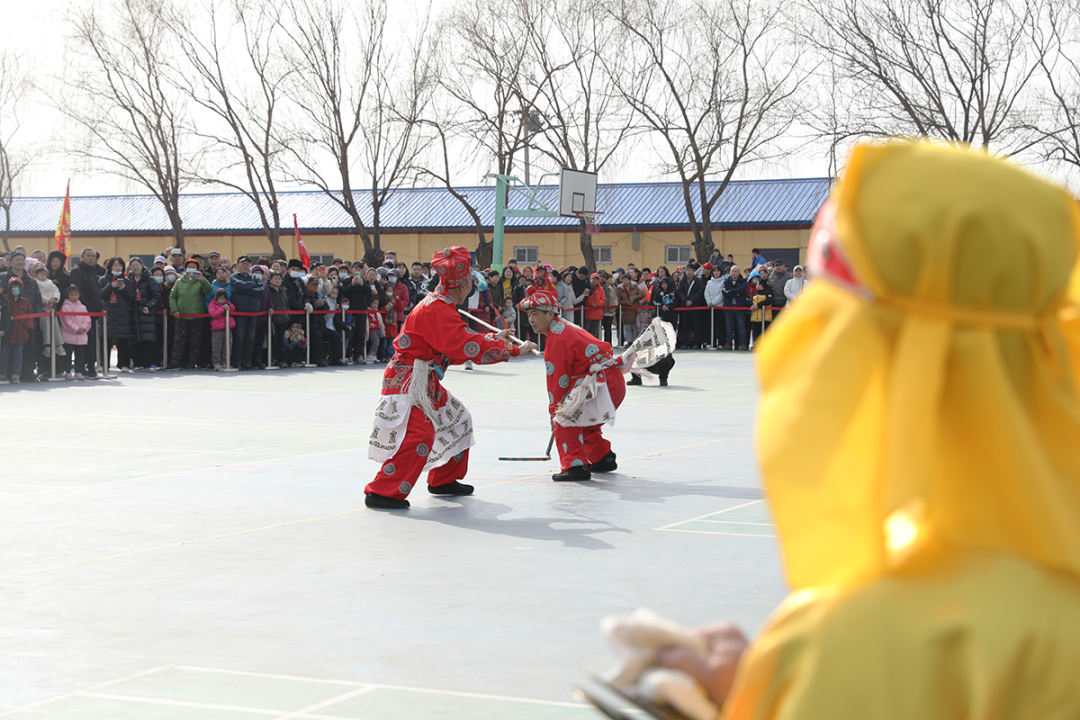 “开路打先锋,五虎紧跟行。”这段顺口溜是“幡鼓齐动十三档”行香走会的顺序,本次大赛也恰巧迎合了传统走会的顺序。五虎棍作为十三档花会中的第二档,其作用是为后续档口的演出开辟场地。马坡镇马卷村的五虎棍在第二组上场,小演员们精神抖擞,跳跃腾空,棍舞疾风,让观众目不暇接,现场掌声不断。