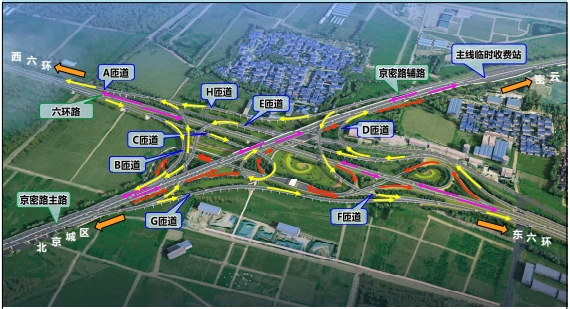 京密路(机场南线-六环路)道路工程南起机场南线,北至六环路,道路长15公里。主路按照高速公路标准设计,设计速度100公里/小时,双向6车道,全线设互通立交5处,出入口4对。