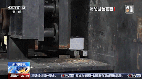 检验人员又模拟电池日常使用中,可能遇到的碰撞,进行压力试验。可以看到受到挤压的电池先是出现明显的内部碎裂声,再突然崩裂,紧接着有烟雾从电池内部窜出,随即爆炸起火。