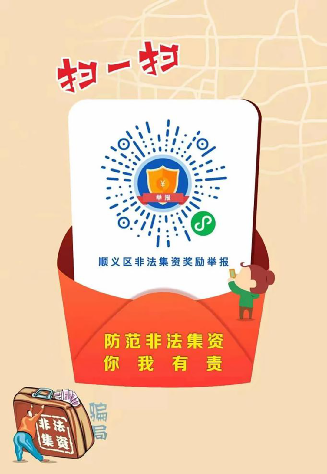 为发动群众举报非法集资活动,顺义区建立非法集资举报奖励制度,扫描下方图片,可以对非法集资金融诈骗进行举报。