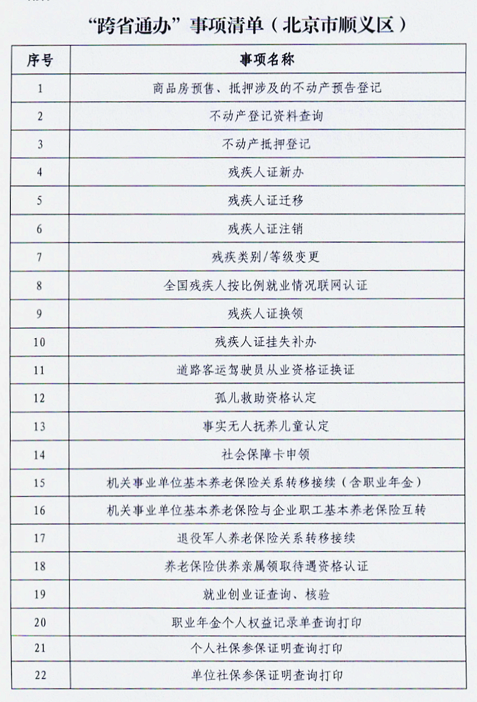 🔼 顺义区“跨省通办”部分事项清单。
