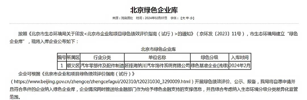 于近日被纳入“北京绿色企业库”