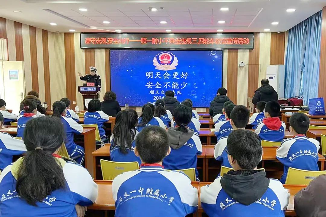 在顺义一中附属小学的开学第一课中,市公安局顺义分局交通支队民警来到现场授课。民警结合学生对道路交通安全的认知特点,以案说法,向学生们重点讲解在马路上追逐打闹、不按交通信号通行、逆行等交通陋习的危害和日常出行注意事项,鼓励同学们积极发挥“小手拉大手”作用,做好家长的监督员和宣传员,不驾驶、乘坐违规电动三轮车,养成自觉遵守交通法规的良好习惯,共创安全和谐有序的道路交通环境。