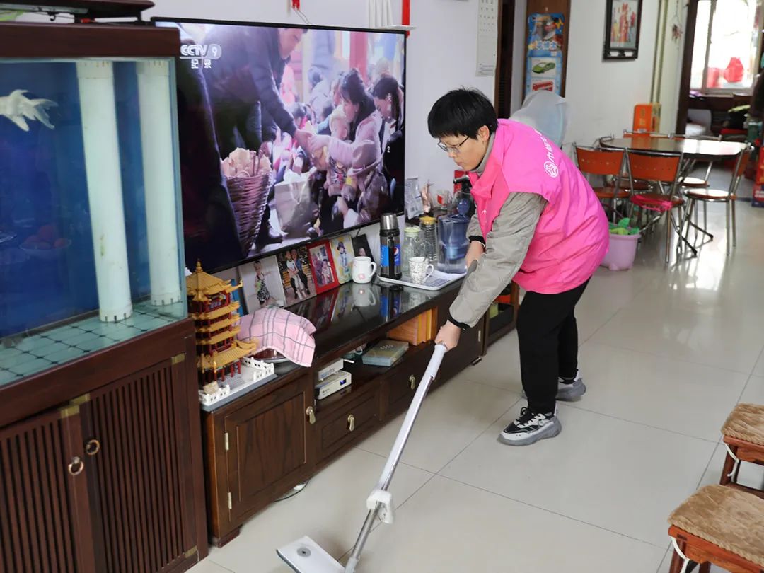 塔河村巾帼亲情服务队志愿者帮老人做家务。