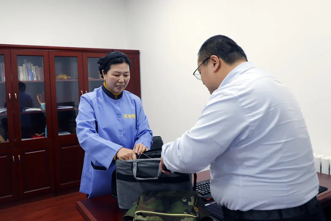 郭秀玲将背包上交至公司,与领导一起查看包内物品。